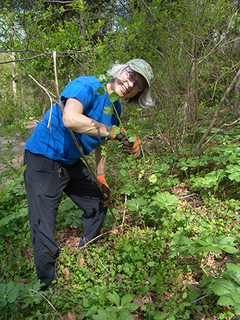 Sandy Whipple, volunteer, continued the effort to control invasives in the Crum Woods, including the now in bloom, garlic mustard (Alliaria petiolata.) photo credit: R. Robert