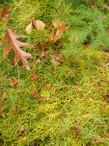 The flowing, frilly texture of Asparagus schoberioides dotted with vibrant red berries. photo credit: R. Robert