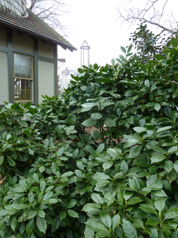 Aucuba japonica 'Rozannie' used as a shrub outside of the Cunningham House/Scott Arboretum offices. photo credit: J. Coceano