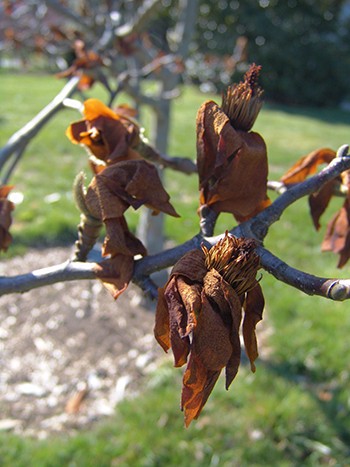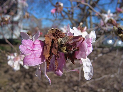 The middle flower of Magnolia x loebneri ‘Leonard Messel’ was burnt by frost. The other two buds were not open during the cold snap and thus have bloomed beautifully. photo credit: R. Robert