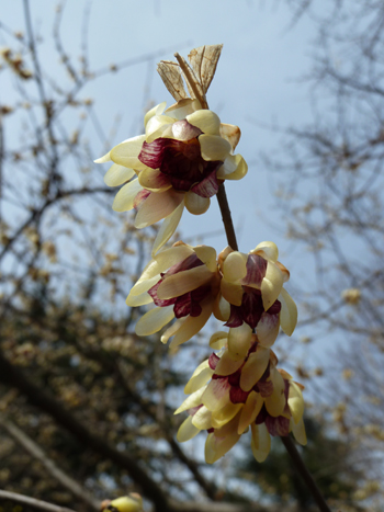 Chimonanthus praecox 'Luteus' currently blooming in the Scott Entrance Garden. photo credit: J. Coceano