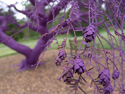 Surprisingly, the purple tree near the fieldhouse tunnel is also a hemlock tree! The tree turned temporary art installation is a weeping variety that looks very different from its larger relatives.