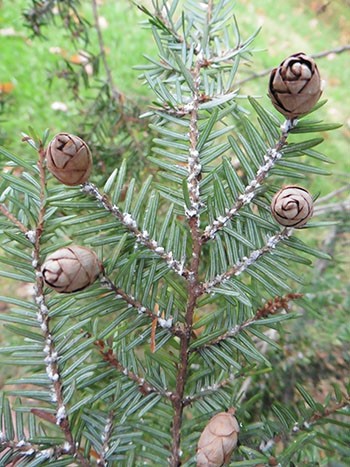 Eastern hemlocks are especially long-lived trees. It takes 40 years before they even begin to produce seeds. Trees can live up to 1,000 years, but many of the hemlock trees on our campus and in the eastern United States will not live a full and natural life. An invasive parasite, called the hemlock woolly adelgid, has infected more than half the native range of eastern hemlock.