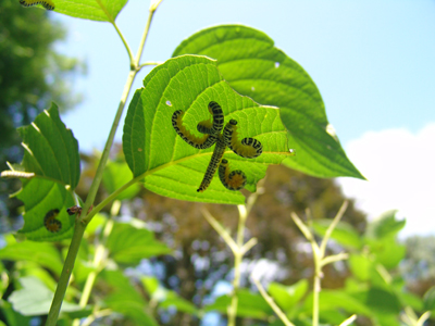 Adult sawflies emerge in late spring and lay their eggs on the undersides of leaves. When the eggs hatch in mid-summer, the first stage larvae are tiny, yellow, and translucent. As they grow and molt, they become covered with a white waxy coating. They usually spend the daylight hours curled up and clinging to the underside of leaves. They can be quite gregarious, with a dozen or more congregating on one leaf. In large numbers, they can cause considerable defoliation and while unsightly, it usually will not harm the plant because it is late in the season. After the last molt, they usually stop feeding and seek a protected spot to overwinter. In early spring, they will pupate and later emerge as adults.
