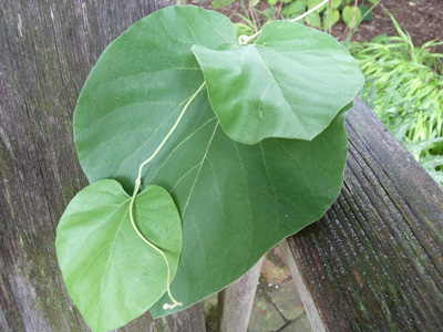 Two accessions are found on the arboretum grounds, Aristolochia macrophylla and Aristolochia tomentosa. The two species are very similar with the major difference being the fuzzy felt-like hairs that cover the leaves on A. tomentosa. This characteristic is especially noticeable on the new growth. Tomentose describes a plant surface covered with densely matted woolly hairs. The hairs are typically white or gray in coloration. Brushwood Nursery states that A. tomentosa tends to range farther into the Midwest and matures slightly smaller. Also, it tends to be more floriferous and bear slightly smaller leaves.