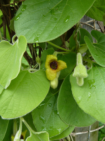 Aristolochia macrophylla and A. tomentosa are eastern North American natives. The vine is commonly encountered along the Blue Ridge Parkway with a range spanning from Pennsylvania to Georgia and west to Kansas. Vines are capable of scrambling 20-40’ and produce woody stems with maturity. While the vine is a vigorous grower it is refined in habit. It doesn’t attempt to pull down its support or grow into it. Further evidence of its refinement and utility was the commonplace practice of growing either species as a living shade curtain on verandas and porches. The vine was trained up strings or lattice wherever shade and privacy was desired. Leaves, 6-12” wide, orient themselves toward the sunlight providing an elegant and cool screen.