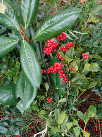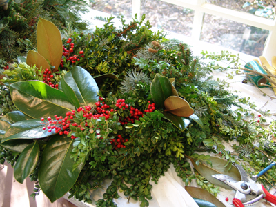 Almost all the cutlivars of Magnolia grandiflora are coveted for wreath making. The large, bold, leather, lustrous leaves make a wonderful background for berries and finer textured foliages, like coniferous evergreens. Eastern red-cedar, Juniperus virginiana; Hinoki cypress, Chamaecyparis obtusa; English yew, Taxus baccata and the white pine, Pinus strobus are some of the great evergreens used in green wreaths. The beautiful foliage of M. grandiflora also provides a bold juxtaposition to the berries of winterberry, Ilex verticillata; American holly, Ilex opaca; and heavenly bamboo, Nandina domestica.