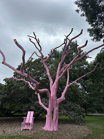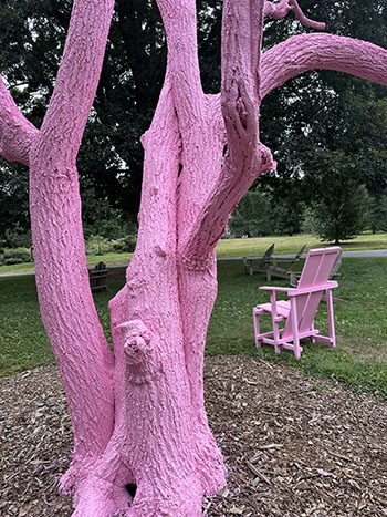 This Chionanthus retusus (Chinese fringe tree) was an older specimen that had been in decline and was ultimately lost earlier this summer. It is the fourth tree that Scott Arboretum & Gardens has transformed in this way, using striking color to draw the community’s attention to the ever-changing landscapes in a beautiful and meaningful way. The bold pink gives new “life” to the dead tree, honoring its presence and history while prompting reflection on impermanence and renewal.