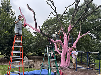 This August, Scott Arboretum & Gardens created its latest ephemeral environmental art piece, Little Princess! Horticulturist Josh Coceano and Arboretum interns painted a lifeless tree an efflorescent pink to encourage reflection on the fragility of trees and to inspire people to notice the landscape, rather than take it for granted.