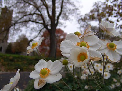 Unlike spring anemone, Anemone x hybrida ‘Honorine Jobert’ blooms in the fall on long graceful upright stems. The multitude of pure white flowers is dramatic against the fall color on the Magill Walk. During the growing season, the solid clumps of dark green leaves look attractive en masse. Doing well in full to partial sun, the flowers make great cut flowers.