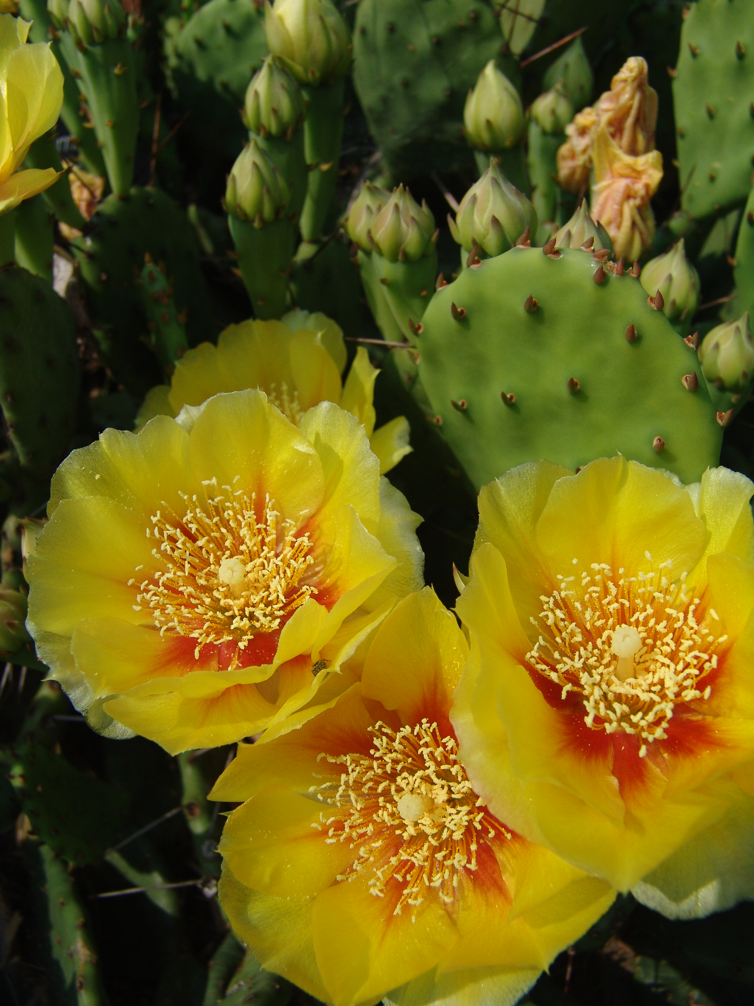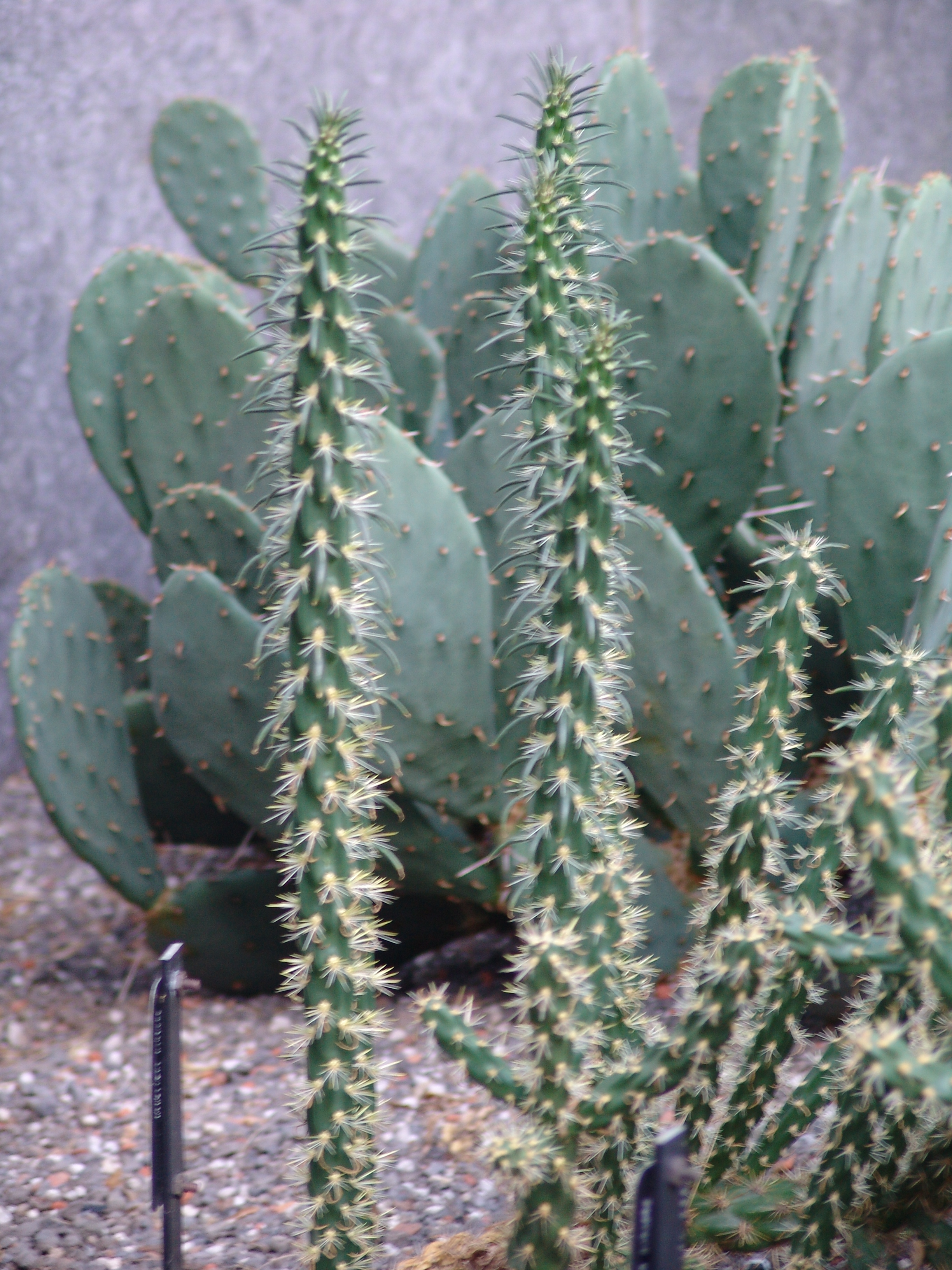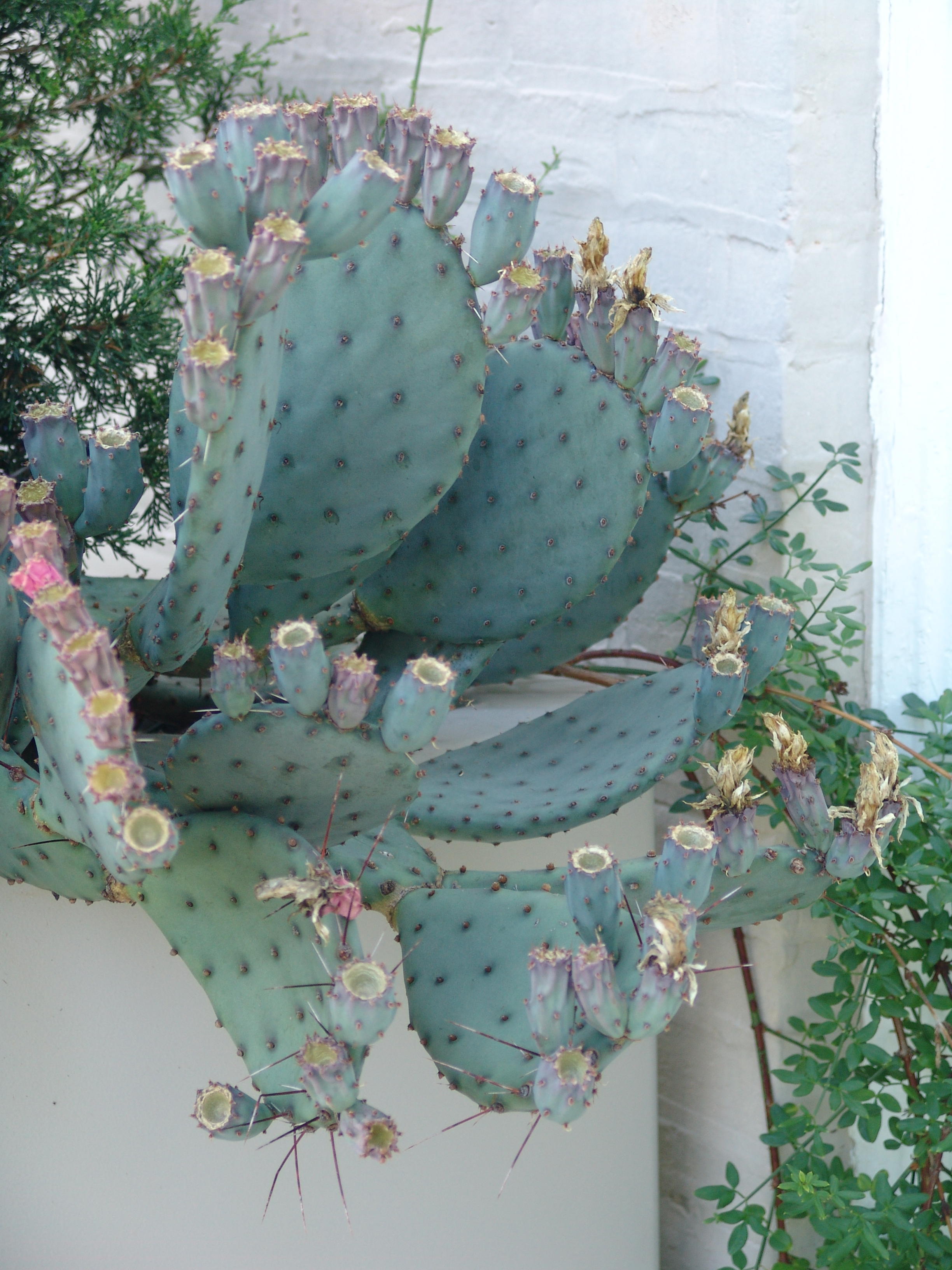 The Arboretum’s greatest concentration of Opuntia can be found outside the Science Center, next to the large glass windows of Eldrigde Commons. This corner of the building is dry and hot because of a building overhang and its location at the corner of the Science Center. It seemed a perfect spot for a cactus collection.