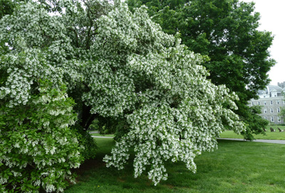 A beautiful specimen of C. retusus shines in the Cosby Courtyard. The single-trunk specimen is very floriferous. Outside Pearson Hall, near the Lilac Collection, one can observe firsthand the differences between C. virginicus and C. retusus. The planting showcases mature specimens of both species. Look for C. retusus ‘China Snow’ at the 2011 Scott Associates Plant Sale.