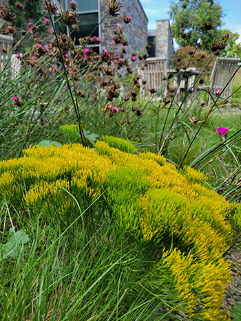 For those familiar with Bigelowia nuttallii, it can be a pretty decisive plant. Some are fans while others feel that it looks somewhat alien with its little spikes of yellow flowers and oddly branching foliage all tucked into a small mound no higher than a foot. This however, is exactly why I love it! The strong colors of Nuttall’s rayless-goldenrod play well with other brightly colored blooms or grasses as it does here in the Sporobolus beds, near the Science Center. Bigelowia nuttallii can be a bit finicky as it does prefer loose well draining soil and will come and go, often seeding randomly throughout the garden. While it is vaguely reminiscent of other members of the Asteraceae family, Bigelowia nuttallii adds a funky charm that I think should be appreciated in the garden. photo credit: W. Lapp