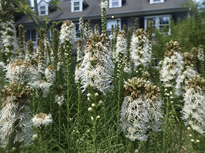 The tall, upright flower spikes bloom from the top down, and grow 3 to 4 feet tall. The foliage adds a nice feathery texture before the blooms really start showing off. The white really pops, especially in contrast with deeper colors or late-summer greens. These stems are strong and not too floppy. And when they sway in a breeze, the movement guides your eye upward, creating rhythm and structure in the landscape. Pollinators also love it! It’s an excellent cut flower, adding both height and freshness to summer arrangements. You can find it planted at the West Garden.