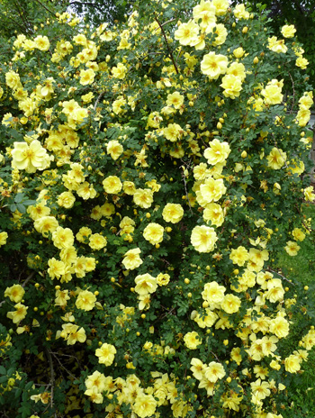 Rosa ‘Harrison’s Yellow’ is one of many roses in bloom at the Dean Bond Rose Garden. ‘Harrison’s Yellow’ is a free-growing, upright form reaching 6’ in height. A multitude of sulfur-yellow, loosely double flowers cover the plant in mid-May.
