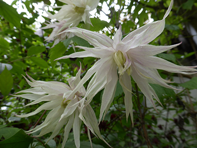 Clematis ‘Porch Swing’, a Polish variety raised by Szczepan Marczyn’ski, was introduced in 2012. Its flowers, nearly cream in color with faint hints of pink, are borne on both last year’s wood and on new growth. Flowers occur in May, then sporadically throughout the summer months. This clematis is particularly suitable for training along fences, garden supports, or over deciduous or coniferous shrubs. In the Terry Shane Teaching Garden a specimen grows up a mature Camellia. Photo credit: J. Coceano