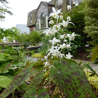 Garden supervisor Chuck Hinkle’s appreciation for Epimedium has rubbed off. There are over 60 species and numerous cultivars and crosses of this hardy perennial groundcover. One Epimedium which I’m excited about is Epimedium ‘Splish Splash’. A seedling introduced by Plant Delights in 2013 that boasts green leaves heavily splashed with reddish-brown markings and numerous sprays of small white flowers. A mass of ‘Splish Splash’ has been planted under the Magnolia virginiana var. australis ‘Henry Hicks’ in the Entrance Garden where it’s being used to replace invasive Petasites and Houttuynia cordata. Photo credit: J. Coceano