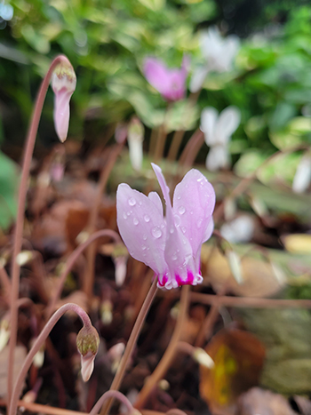 There are many joys of gardening for me, and one of the surprising ones is actually forgetting that a plant is there.  Plants that have a period of dormancy and disappear for a time can be such curious additions.  There’s nothing quite like finding a patch of Cyclamen hederifolium in autumn pushing out its fairy-like flowers in shades of white and magenta, just as the ones here in the Harry Wood Garden are doing.  As the flowers fade, the leaves unravel from the ground like a coiled spring revealing dark green and silver hued foliage that persist through the winter.  Eventually in late spring as the air warms they once again go into their summer slumber, waiting to be forgotten about until being rediscovered in fall. Photo credit: W.  Lapp