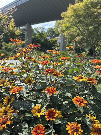 At the entrance to the Harry Wood Garden, you will stumble upon a bed of orange flowers that, aside from not being yellow, look almost like small sunflowers. You would not be alone in thinking that, as these flowers are Heliopsis helianthoides var. scabra ‘Bleeding Hearts’, also known as false sunflower.