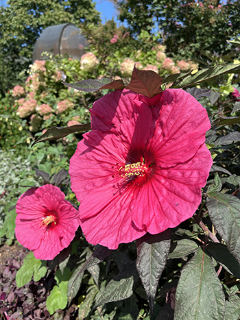 If you take a stroll through the Terry Shane Teaching Garden, one of the more striking flowers you will find in bloom right now is the Hibiscus ‘Candy Crush’. One of the more defining features of most hibiscus are their 5-petaled flowers. The bright bubblegum pink petals of this cultivar overlap, forming a large flower that is both wonderfully circular and symmetrical.