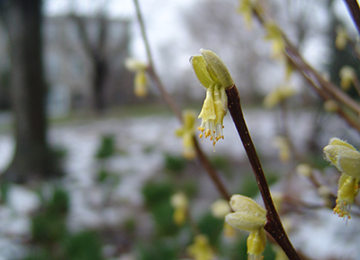 Every year in early spring, the shrub produces a multitude of small, unassuming flowers. The pendulous flowers are soft light yellow and emerge in twos and threes, backed by a pair of downy, nascent leaves. The corollas of the small flowers are diminutive and fused into a narrow sheath from which the pistil and stamens protrude.