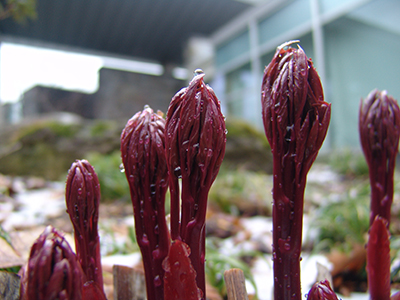 The Harry Wood Garden on the north side of campus is home to several cultivars of herbaceous peonies. Granted, April is an unlikely time to highlight peonies, but today I was struck by the deep burgundy-red of the emerging foliage, reaching from the ground like thick lipstick-colored asparagus. The color and shape suggests something that belongs attached to a coral reef (although not likely the source of the cultivar name). Paeonia ‘Coral Charm’ is noted for its large, doubled, coral flowers that will appear in a few months. Photo credit: J. Bickel
