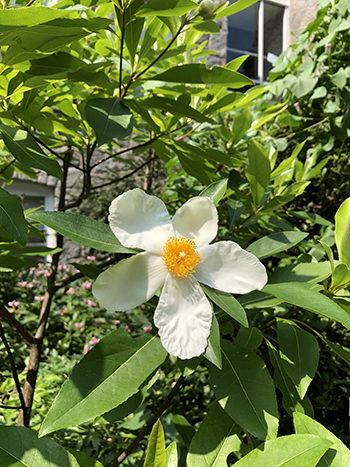 x Gordlinia grandiflora is an interesting study in intergeneric hybridization. The cross, with Franklinia alatamaha as the female parent and Gordonia lasianthus as the male parent, was made in 2002 by Tom Ranney of the North Carolina State University Experiment Station in Fletcher, NC. This fast growing hybrid features the best of both parents. Far Reaches Farm summarized this marriage best with the following: “This is a cross between the very hardy but somewhat finicky deciduous Franklinia alatamaha and the amenable but not so hardy evergreen loblolly bay, Gordonia lasianthus. The result is a plant that is evergreen and vigorous with larger (3″-4″) white flowers than either parent.” A 2010 accession can be seen near Sproul Observatory. The site, offering protection from winter winds and well-draining soil has yielded a happily established specimen. Photo credit: J. Coceano