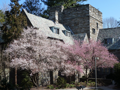 It is hard not to play favorites. I admit to having favorite areas within The Scott Arboretum. The Terry Shane Teaching Garden is near and dear as I personally garden and tend the space. The Harry Wood Garden features a fantastic array of choice bulbs and shrubs under the dappled canopy of Betula nigra. The Nason Garden provides playful contrast between textures while the Metasequoia Allee uses the prehistoric deciduous conifer to link campus buildings. Bond Quad, a residential area forming a quadrant linking Bond and Worth Hall, displays Cotswold style architecture. The buildings have a medieval feel. Small trees and conifers are used to soften the stonework. Prunus mume, also known as Japanese apricot or Chinese plum, is one tree used to balance textures.