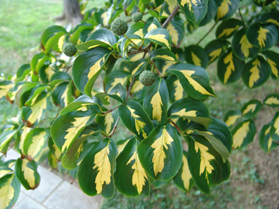 Cornus kousa ‘Gold Star’ is commonly known as kousa dogwood, a small tree offering a rainbow of colors throughout the year. Usually variegation occurs on leaf margins, however, on this plant it’s in the center. Each oval-shaped, glossy leaf is irregularly painted a golden buttery-yellow along the center of its green leaves. In autumn, this yellow center turns red and the green margins turn purple, creating a completely different show of colors. In addition to the leaf variegation, this plant offers reddish stems. In spring, Cornus kousa ‘Gold Star’ features large, showy, white bracts that surround its flowers that slowly fade to pink during its six-week bloom period. These flowers then develop into large, bumpy fruits that start green and ripen to raspberry-red that numerous birds thoroughly enjoy.