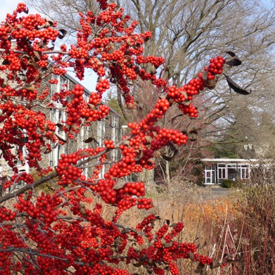 Ilex verticillata ‘Winter Gold’, seen here outside Trotter Hall is a branch sport of I. verticillata ‘Winter Red’ that bears apricot-orange fruit in abundance when planted near an appropriate pollinator such as I. verticillata ‘Southern Gentleman’. ‘Winter Gold’ is a slow-growing deciduous holly that typically matures to 5’ – 8’ tall and wide. Photo credit: J. Coceano