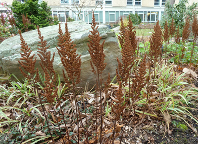 Astilbe chinensis ‘Vision in Pink’ benefits from the moist, nutrient-rich soil and high canopy afforded it in the Harry Wood Garden. The airy soft pink plumes bloom mid-summer and remain ornamental long after flowering has finished. A favorite among Scott flower arrangers. Photo credit: J. Coceano