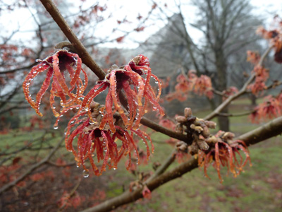 Hamamelis x intermedia ‘Jelena’ is considered by many to be one of the best cultivars to result from crossing Hamamelis mollis and H. japonica. Attributes include vigor, coppery orange flowers, and warm fall color. ‘Jelena’ is consistently one of the first H. x intermedia cultivars to bloom at the Scott Arboretum. The cultivar was named in 1954 by Robert de Belder, a witchhazel enthusiast responsible for naming many cultivars, in honor of his wife. Photo credit: J. Coceano