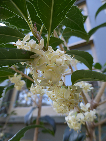 The element of surprise fragrance in the garden appeals to both the sense of smell and one’s curiosity. Just where is that scent coming from? Osmanthus x fortunei with its clusters of creamy white flowers provides a sweet greeting to visitors entering the front door of the Cunningham House. The source of the odor isn’t obvious as the holly-like foliage conceals the blossoms. An evergreen shrub, Osmanthus x fortunei can grow upwards of 20’ yet responds well to shearing and is easily kept to more restrained heights. Plant in full sun for dense growth and abundant flowering. Photo credit: J. Coceano