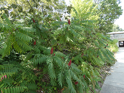 R. typhina is the largest of North American sumacs, reaching up to 25’ tall with a spreading habit. It spreads aggressively through underground rhizomes and needs a large, open space where it can form colonies. It does well in a broad range of soil types as long as it is in a well drained area. R. typhina is a pioneer plant that appears along roadways, vacant city lots, and other disturbed areas. Because of its similar leaf pattern and similar eagerness to grow in difficult conditions, it is often confused with the non-native and invasive Ailanthus altissima (tree of heaven).