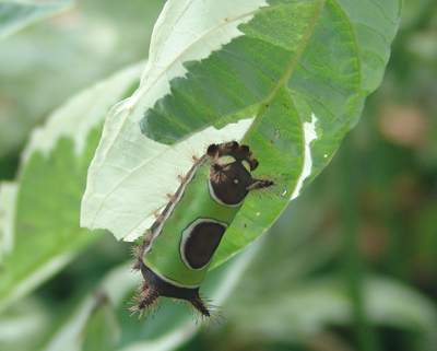 The caterpillar’s common name refers to the brown, saddle-like blotch in the center of its rich kelly green back. Each end is capped with reddish-brown and bears a pair of imposing bristly “horns.” The head is moustachioed with additional spines and the tail end bears large white eye spots reminiscent of spiderman’s. Both sides of the abdomen are lined with yet more spines.