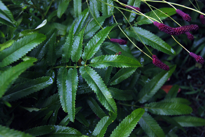 The Japanese burnet is a plant that I have only observed on a few occasions, but it has always left a lasting impression. Lately I have been admiring a planting of Sanguisorba tenuifolia ‘Purpurea’ near the Sproul Terrace steps. Its burgundy red flowers bobbing in the air are hard to miss. The size of this plant is not overwhelming, even though the foliage reaches a substantial four feet in height. The bulk of this plant’s body remains close to the ground, consisting of long compound leaves in a basal arrangement. If you do not want to focus on flowers, one can emphasize the continuity of seasonal interest, as the burnet’s pinnate foliage is a major asset. The compound leaves are concentrated near the ground and slowly ascend, culminating in late summer with burgundy flowers atop long scapes. The edge of each leaflet has a very pronounced serration, which gives the collective foliage an intricate texture.