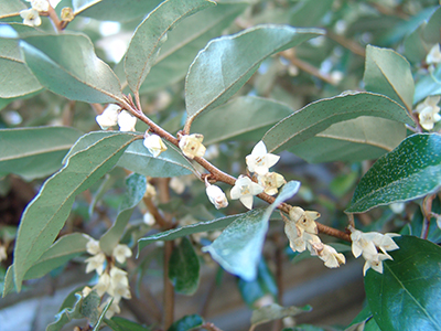 Currently tantalizing your sense of smell in the Theresa Lang Garden of Fragrance, Elaeagnus pungens has inconspicuous flowers with a large scent. Described as sweet smelling and similar to a gardenia, the bell-shaped, creamy white flowers bloom tucked under the evergreen leaves. This planted is best used as a broadleaf evergreen windbreak or screen in your garden. While pruning is required to keep the plant “in bounds,” you are rewarded with a pleasant scent throughout your garden from October into November.