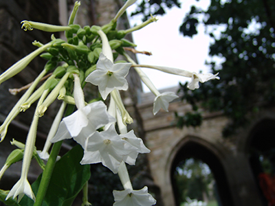 Nicotiana flowers are large, dramatic white, trumpet-shaped blooms, opening in pendant clusters. photo credit: R. Robert
