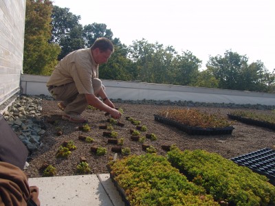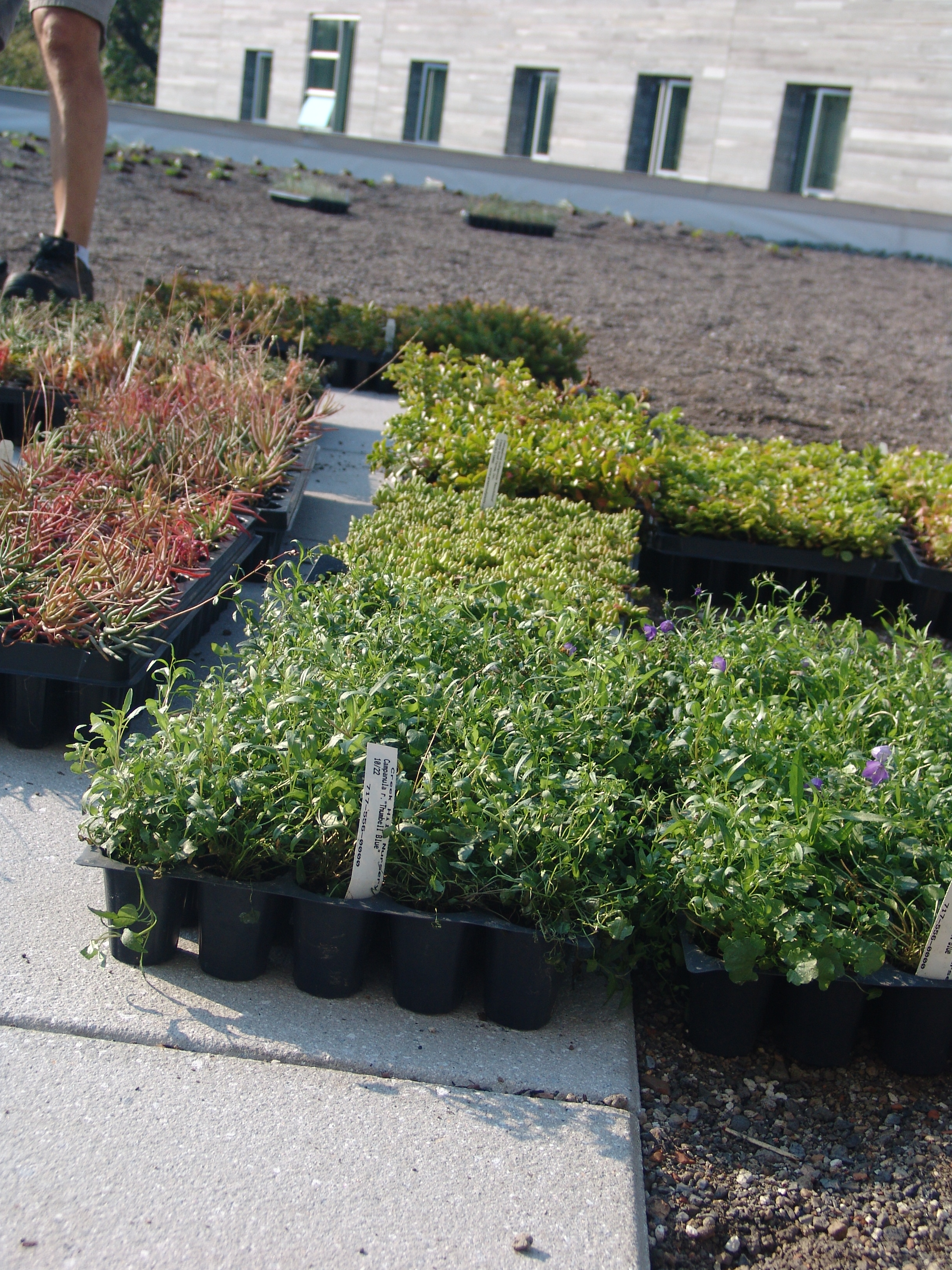 Several types of accent plants were added to this portion of the roof as well. Accent plants do not grow as rapidly as groundcovers and offer seasonal interest. Accent plants also do not have as long a life expectancy as groundcovers, thus requiring periodically replenishing.