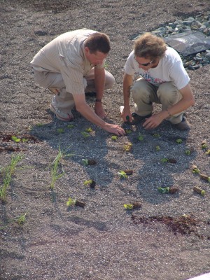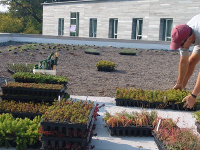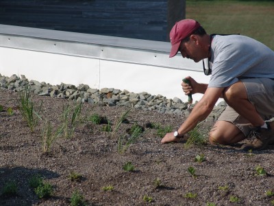 Yesterday, we discussed how the majority of the Kemp Hall green roof was planted. Today, we will explore the remaining level and the excitement that a few more inches of growing media can bring. The remaining level was planted using a different technique because it is the semi-intensive section. This portion of the roof features mounds of the growing media eight to ten inches thick allowing for planting of perennials and bulbs, and a paver area to allow tours to step out onto the roof.