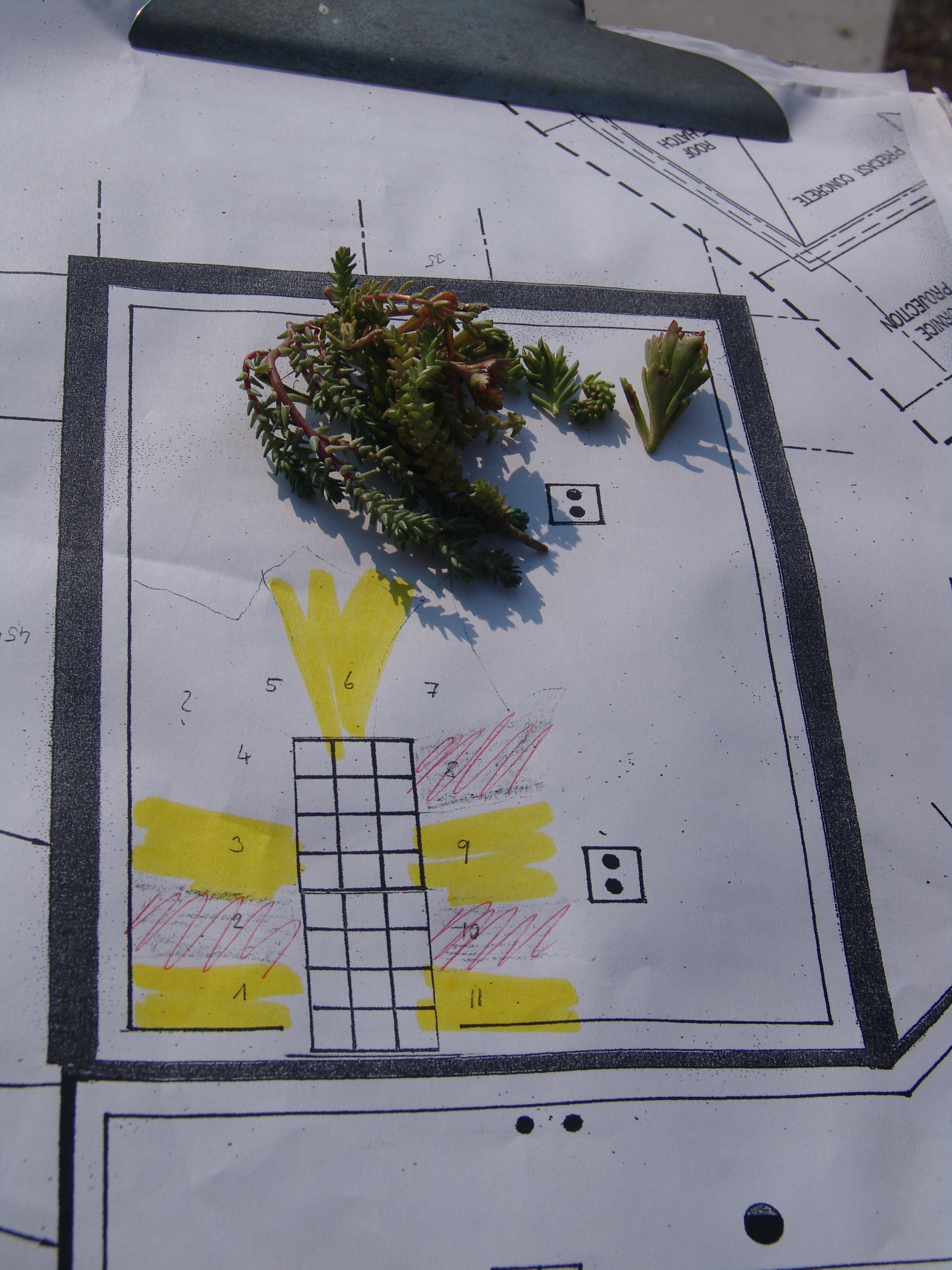 To plant this portion of the roof, plugs were used instead of cuttings. Plugs were chosen because they allow the designer to create precise, highly individualized design. Using plugs of various types of sedums, large swathes of color were created radiating out from the paver section on the roof as seen in the sketch below.