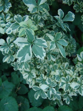 Eleutherococcus sieboldianus 'Variegatus' is a dry shade woody with great color interest. photo credit: R. Maurer