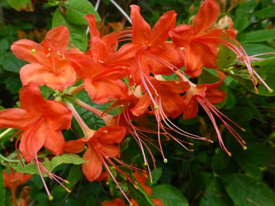 The red-orange July through August blooms of Rhododendron prunifolium. photo credit: C. Sawyers